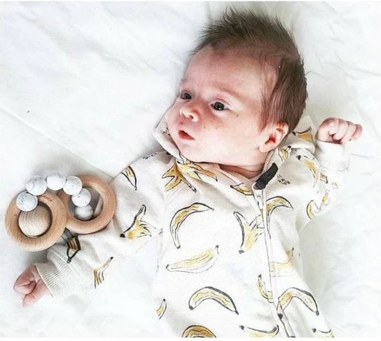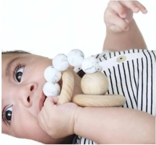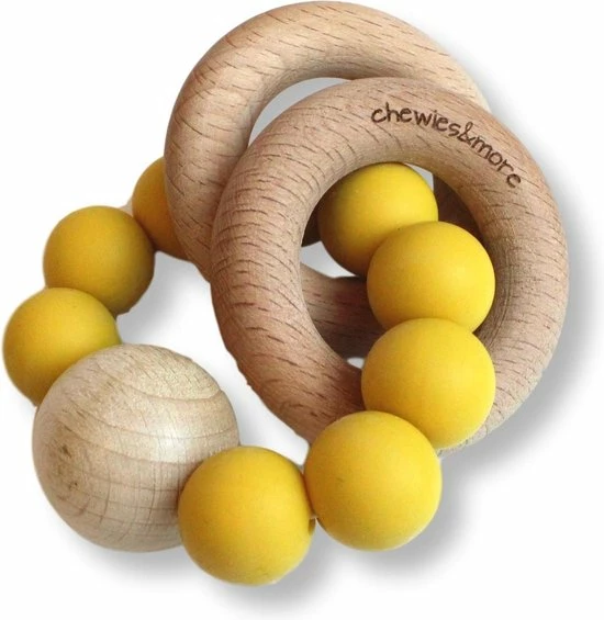 Deze toffe Chewie Rattle is gemaakt van silliconen kralen in combinatie met een grote houten kraal en 2 ringen die makkelijk vast te houden zijn voor je kleintje en een rustgevend rammelend geluid maken.