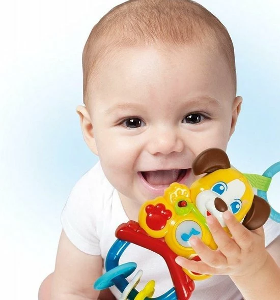 Deze schattige puppy is een elektronische rammelaar met heldere geluidseffecten. Het heeft een Start-Stop-knop. De oren zijn gemaakt van zacht plastic, ideaal voor kinderen om op hun tanden te bijten. De buik is een interactieve knop die oplicht. Het activeert geluiden en melodie�n.