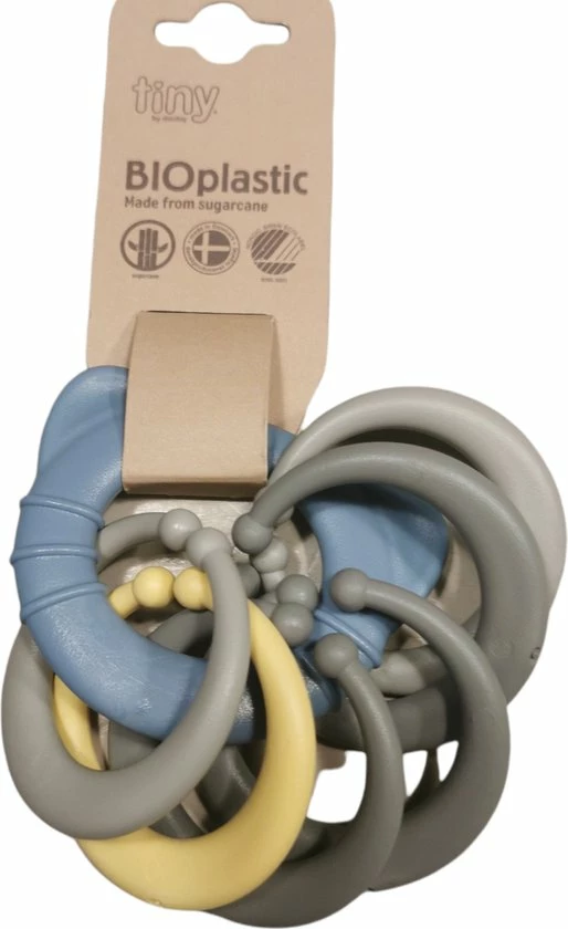 De Tiny bijtringketting wordt in Denemarken geproduceerd en gemaakt is van hernieuwbare grondstoffen en het Nordic Swan eco-label heeft gekregen.