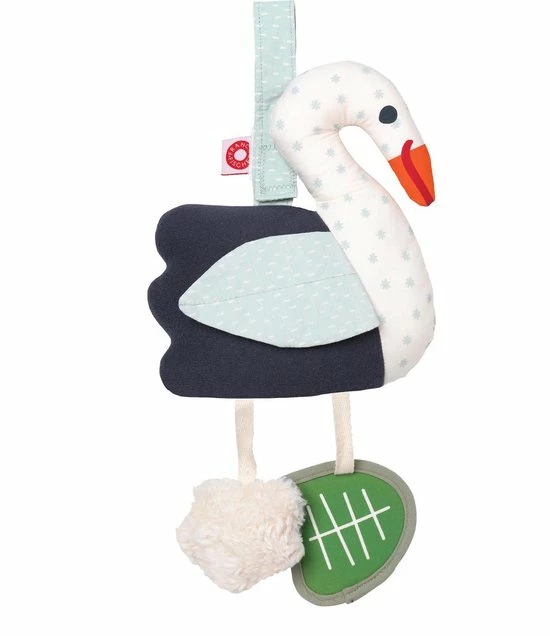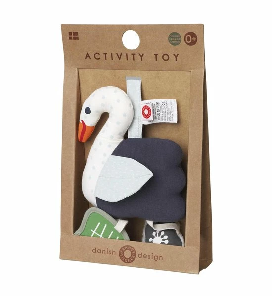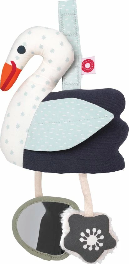Filippa Zwaan is gemaakt van zacht biologisch katoenen pluche met een vulling van maïsvezel. Hang hem eenvoudig met een klittenband aan de babygym, kinderwagen, autostoel, commode of bed.
