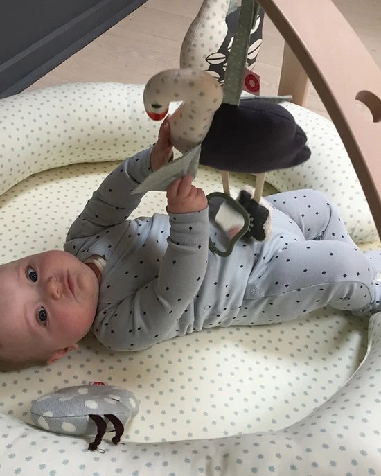 - Materiaal: Stof: 100% gecertificeerd biologisch katoen, bedrukt met milieuvriendelijke kleurstoffen. Vulling 100% maïsvezel. Plastic craquelé papier in de vleugels. Kunststof spiegel en kunststof rammelaar in hangers.