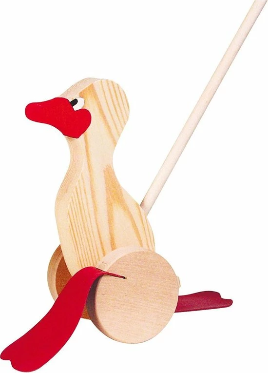 Houten Loopstok Eend waggelt lekker in het rond.