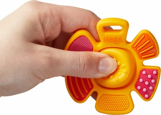 Vooral in de eerste maanden verkennen baby’s alles met hun mondje. Deze leuke bijtring is daar perfect voor, want zijn verschillende oppervlakken bieden alles voor een gevarieerde ontdekkingstocht. Bijzonder boeiend: het midden kan naar binnen en naar buiten worden gebogen. Dit zorgt voor een grappig plop-effect!
