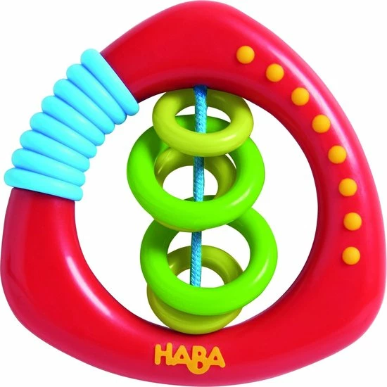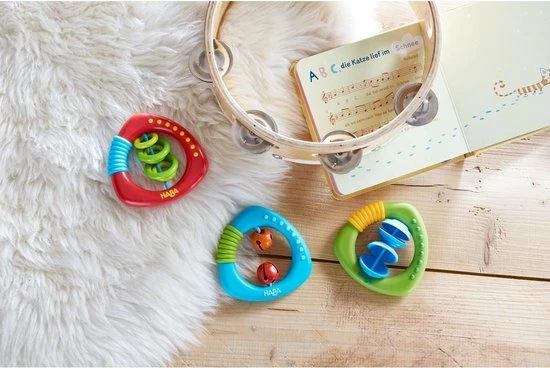 Deze robuuste kunststof rammelaar fascineert baby’s met grappig geklepper.