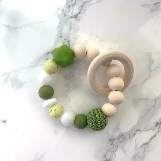 Onze bijtringen bestaan uit siliconenkralen, wolkralen en houtenkralen die allemaal geschikt zijn voor de kleintjes en dus ook kindvriendelijk.