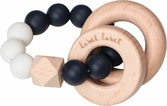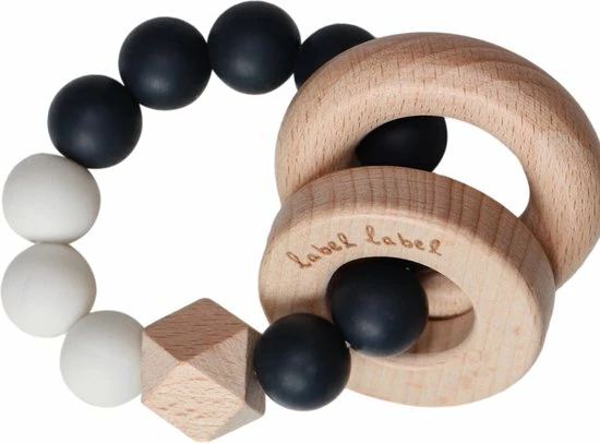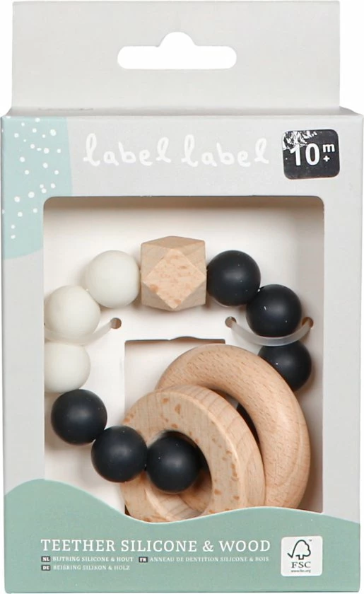 Wat een fijne en mooie bijtring is dit van Label Label! De bijtring is gemaakt van siliconen kralen met daaraan houten cirkels. Zo leert je kleine verschillende structuren herkennen.