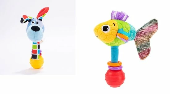 Deze set van 2 rammelaars bestaat uit: de Blauwe hond en de Vis met de gekleurde staart. Rammelaars uit de dieren rammelaars serie. De hond rammelaar uit de dieren rammelaars serie. Deze toffe hond heeft veel verschillende kleuren met een blauwe basis met lapjestof sjaal en oortjes. De gele kunstof bol zorgt voor het gerammel. De vis heeft veel verschillende kleuren met een gele basis met gekleurde vinnen en een grote bijzonde gekleurde staart. De rode kunstof bol zorgt voor het gerammel.