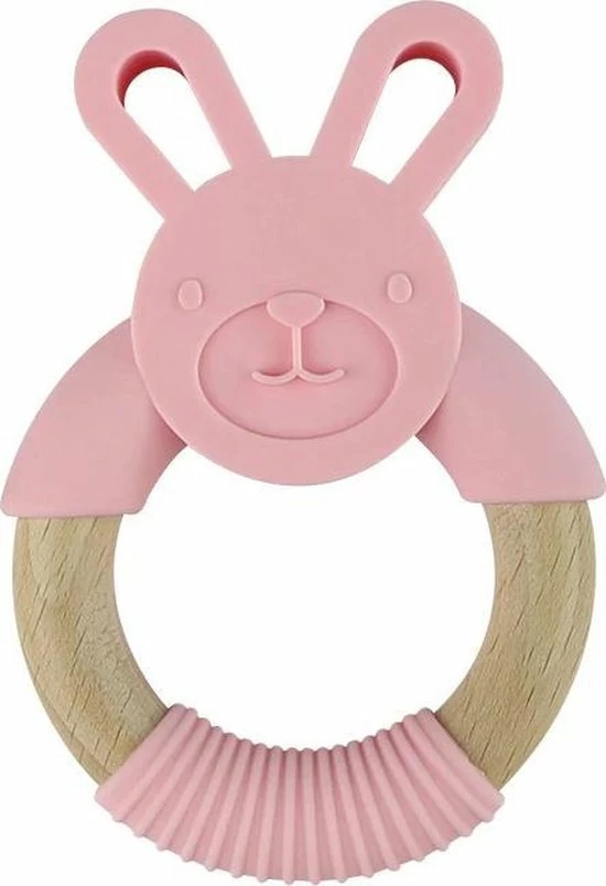 Dit lieve konijntje is leuk om mee te spelen en lekker om op te sabbelen en kauwen. Het gekleurde gedeelte van het konijntje is van silicone (BPA-vrij). De houten ring is gemaakt van beukenhout, dit splintert niet. Dit maakt het hele konijntje bijtveilig.