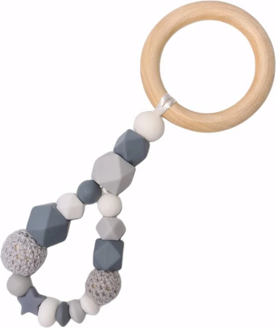 Sabbelen, bijten, knagen en ga zo maar door. Alles gaat in het mondje. Een bijtring biedt de oplossing. Het silicone- en houtenmateriaal is een heerlijke sensatie voor het kindje, vooral wanneer de tandjes doorkomen. Alle bijtringen zijn uniek en handgemaakt, de samenstelling van kralen kunnen op elkaar lijken maar geen enkele bijtring van Jela wordt op dezelfde volgorde in elkaar gerijgd. De foto is een voorbeeld, u ontvangt een vergelijkend exemplaar.