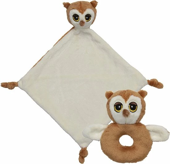 Pluche dieren setje uilen knuffels rammelaar van 15 cm en tutteldoekje 40 cm. Combinatie van een knuffeldoekje en een baby/peuter knuffel. Geschikt voor baby en peuter, dus o.a. leuk als kraamcadeau. Met gestikte oogjes, dus veilig voor baby’s. 2 uilen knuffels.
