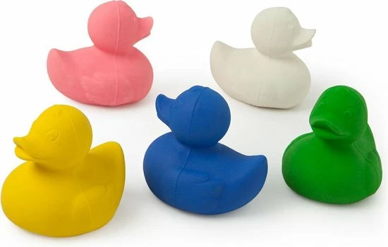 De eend is gemaakt van 100% natuurlijk rubber dat afkomstig is van de Hevea bomen. Er zitten geen gaten in het ontwerp waardoor bacteriën en schimmels geen kans hebben zich te nestelen. De bijt- en badspeeltjes zijn met de hand beschilderd met natuurlijke pigmenten. Hygienisch, duurzaam, veilig om in te bijten en helemaal eco-vriendelijk!
