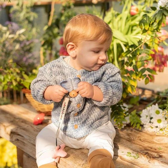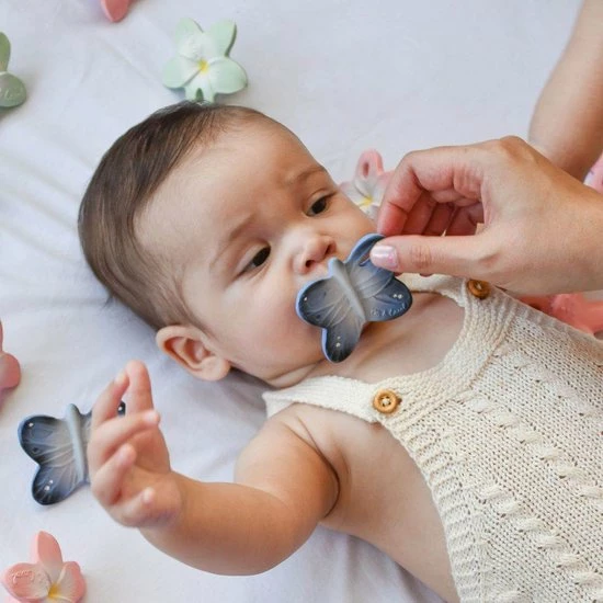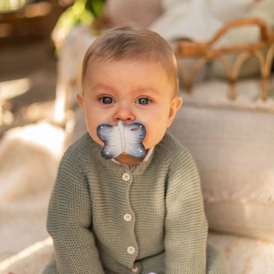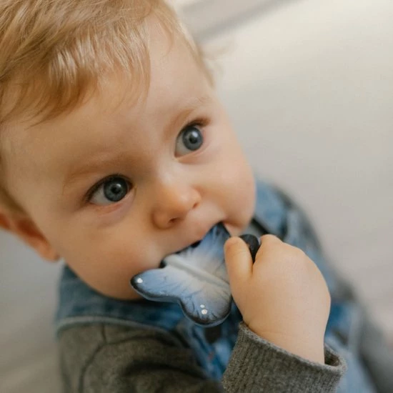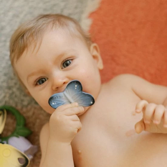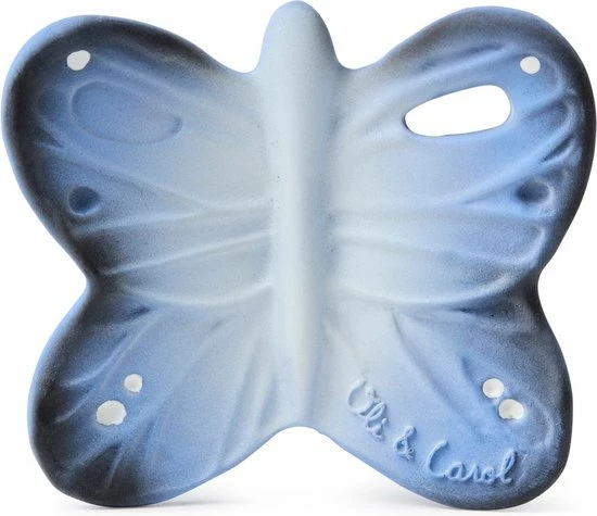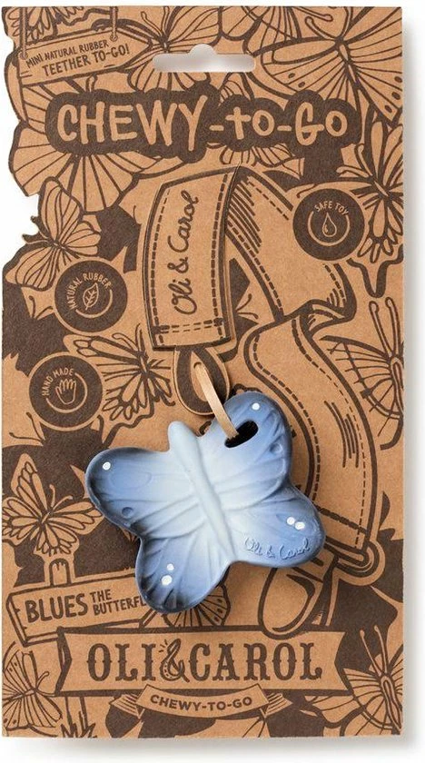 Grappig bijtspeeltje blues the butterfly uit de nieuwe chewy to go mini collectie van Oli&Carol, dit bijtspeeltje heeft een ergonomische vorm waardoor het voor baby’s erg makkelijk is om het bijtspeeltje vast te houden. De verschillende texturen zoals bobbeltjes en puntjes maakt het bijtspeeltje erg plezierig om op te bijten en te sabbelen. Het mini chewy to go bijtspeeltje is makkelijk te bevestigen aan een speenkoord of een knuffeldoek zodat je de chewy to go overal mee naar toe kunt nemen. De chewy to go bijtspeeltjes helpen bij de natuurlijke ontwikkeling van de mond van baby’s en stimuleert hun zintuigen. Elk bijtspeeltje is uniek, ze zijn handgemaakt van 100% organisch rubber en daarna met de hand beschilderd met 100%organische verf uit planten. Het perfecte duurzame cadeau voor elke baby!
