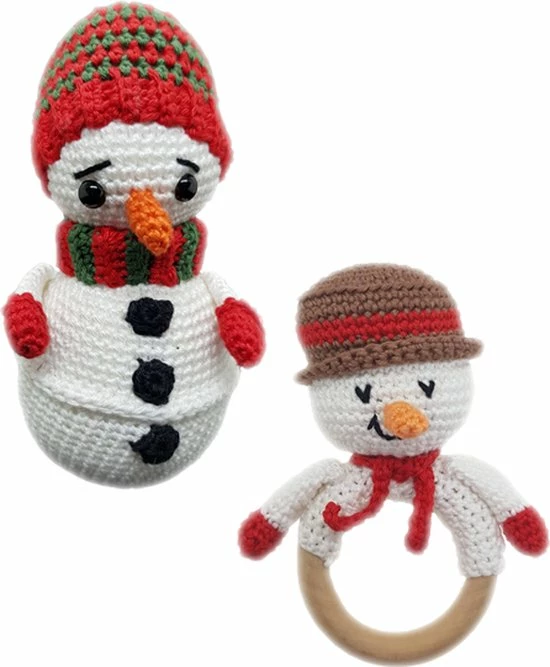 In het kopje zitten veiligheidsoogjes. De mini tuimelaar is leuk te combineren met de sneeuwpop rammelaar