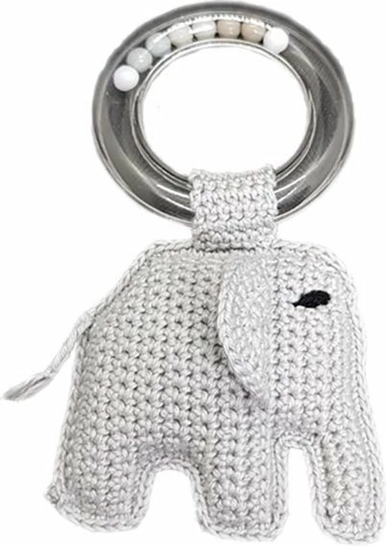 Deze leuke gehaakte rammelaar van “Per il Bambino” in de vorm van een Olifant wordt vast het favoriete speelgoed van je baby. In de rammelring zitten 8 schattige kraaltjes in diverse kleuren grijs. De vrolijke rammelring is van polycarbonaat, dit is stevig, hard en gemaakt van doorzichtig kunststof. De rammelring is getest en voldoet aan de Europese veiligheidseisen. De rammelring van de knuffelbare olifant stimuleert de hand-oogcoördinatie en prikkelt de nieuwsgierigheid van je baby en is makkelijk vast te houden aan de rammelring. De olifant is gehaakt van zacht katoen draad