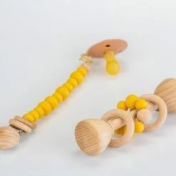 Petit Adventures Speenkoord Met Houten Rammelaar Okergeel – Gift Set