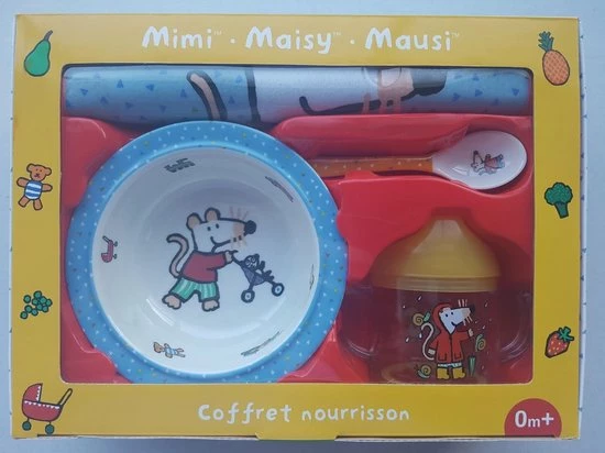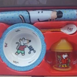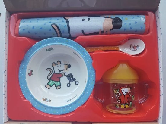 Baby set van Muis/ vla schaaltje met zuignap voor op de kinderstoel/lepeltje/slabbetje/drinkbeker met 2 oren.
