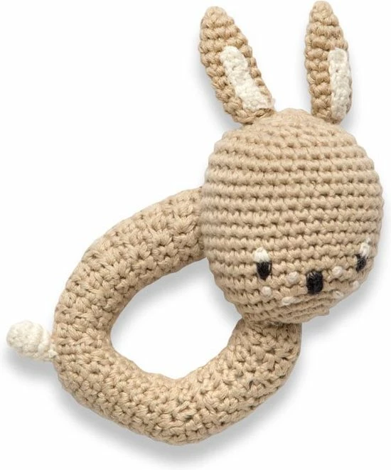 Deze mooie en grappige rammelaar van het Deense merk Sebra is met de hand gehaakt, wat het een uniek item maakt. Kleine babyhandjes zullen al snel de kop en pootjes van het konijntje weten vast te pakken. De rammelaar is gemaakt van 100% katoen met polyester vulling. Het konijn is 15 cm lang en 7 cm breed. Leeftijd: 0+.