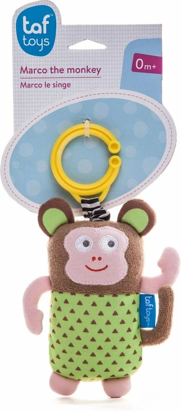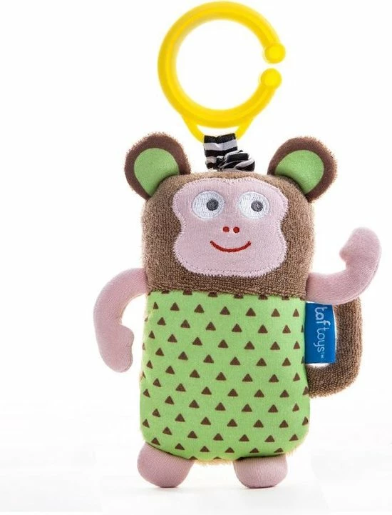 Dit vrolijke aapje van TafToys is heerlijkzacht om mee te knuffelen. Het trekkoord maakt ratelgeluid en stimuleert de motoriek van je kindje. Dankzij de grote clip aan het trekkoord kan het knuffel aapje overal aan worden bevestigd.