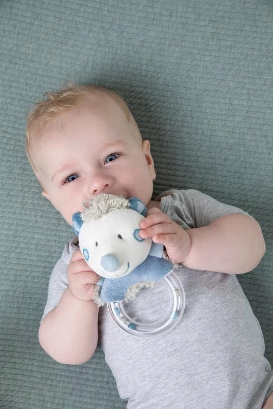 Leuke rammelaar met hoofdje van het egeltje. De balletjes in de ring zorgen voor een leuk rammelgeluidje. Stimuleert de hand/oog coördinatie van je kindje.