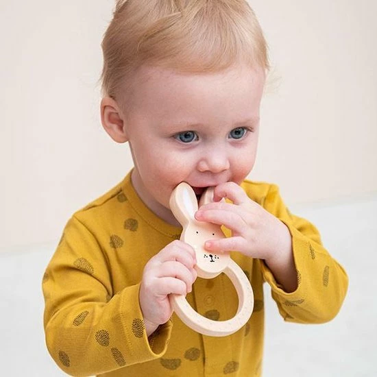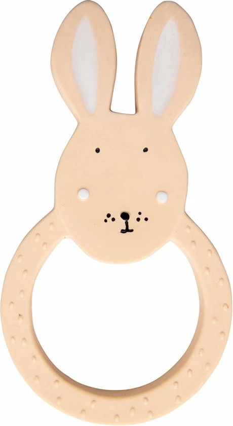 Bijtring Mrs. Rabbit is super leuk babyspeelgoed gemaakt uit 100% natuurlijk zacht rubber en dus perfect veilig voor je baby. De bijtring verlicht de pijn bij doorkomende tandjes, maar is bovendien ook een leuk grijpspeeltje heel makkelijk te grijpen door kleine handjes.