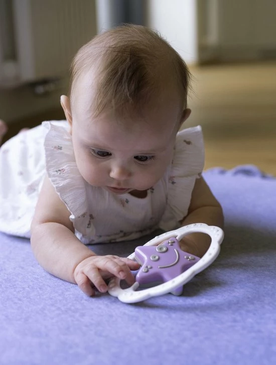Een mooie pastel rammelaar ontworpen voor de jongste kinderen. De rammelaar heeft sensorische projecties die de tastzin van de baby stimuleren. Het is erg licht en past perfect bij babyhandjes.