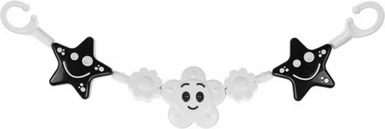 Vrolijke rammelgeluiden begeleiden je baby tijdens dagelijkse activiteiten wandelingen. Zwart-witte kleuren stimuleren het gezichtsvermogen perfect een baby die nog geen kleuren kan onderscheiden. Zachte geluiden Rammelaars stimuleren het gehoor en speelse vormen trekken elkaar aan aandacht van het kind. De ratel is eenvoudig te monteren op een trolley of een wieg of een ledikant De rammelaar is gemaakt van de hoogste kwaliteit in de EU kwaliteit van gecertificeerde grondstoffen bevat geen BPA en
